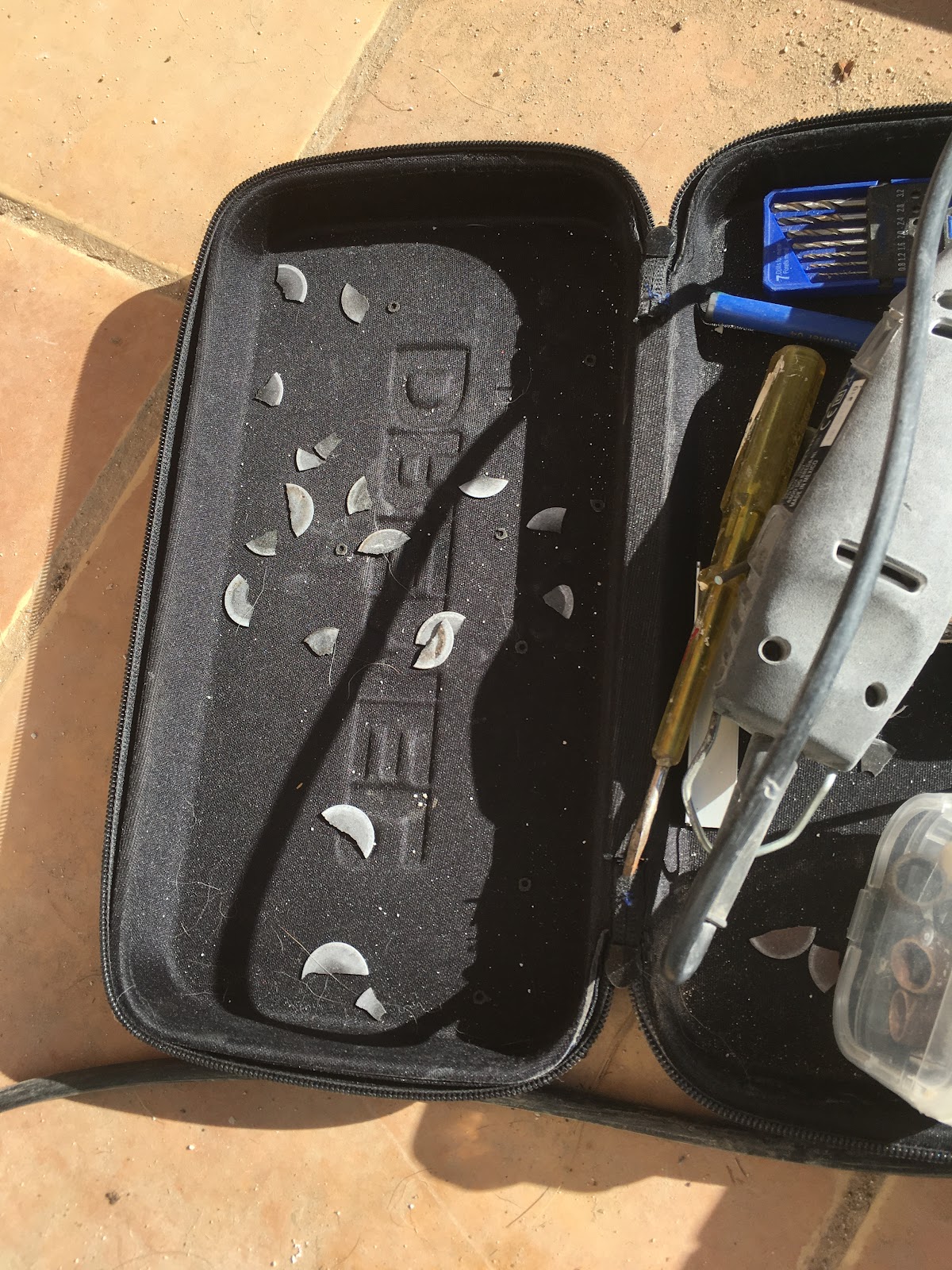 Engineer Jansen has been too generous (as he is) with the tile glue, so that has more or less filled the joints. Not good, grout has to sit on top of glue. So, out with his trusty Dremel!